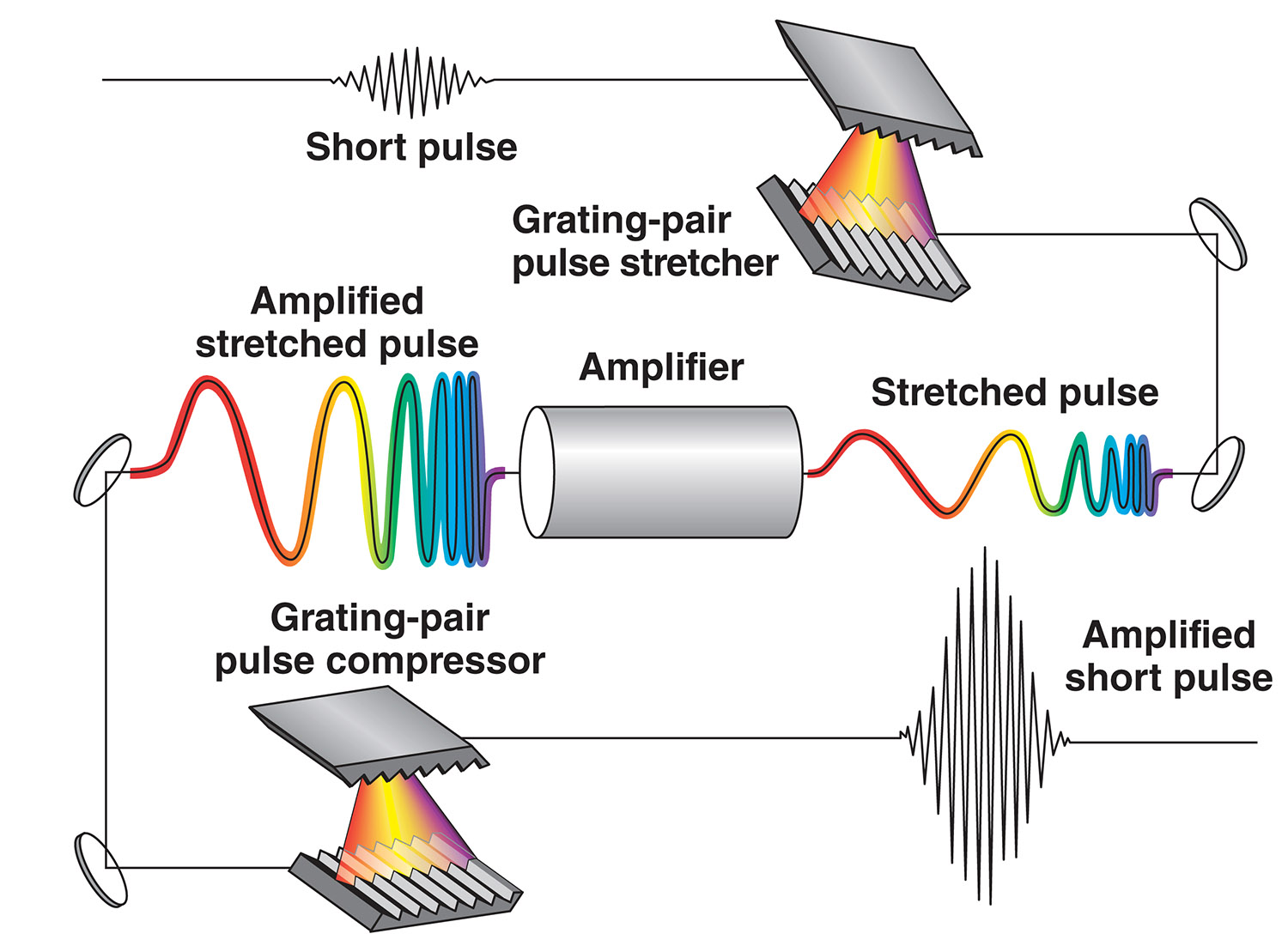 Application: Enabled the creation of extremely powerful laser systems Orthogonality and Linearity: involves stretching an ultra-short laser pulse in time, amplifying it, and then compressing it back to its original duration. This process allows the amplification of pulses to extremely high peak powers without damaging the amplifying medium.